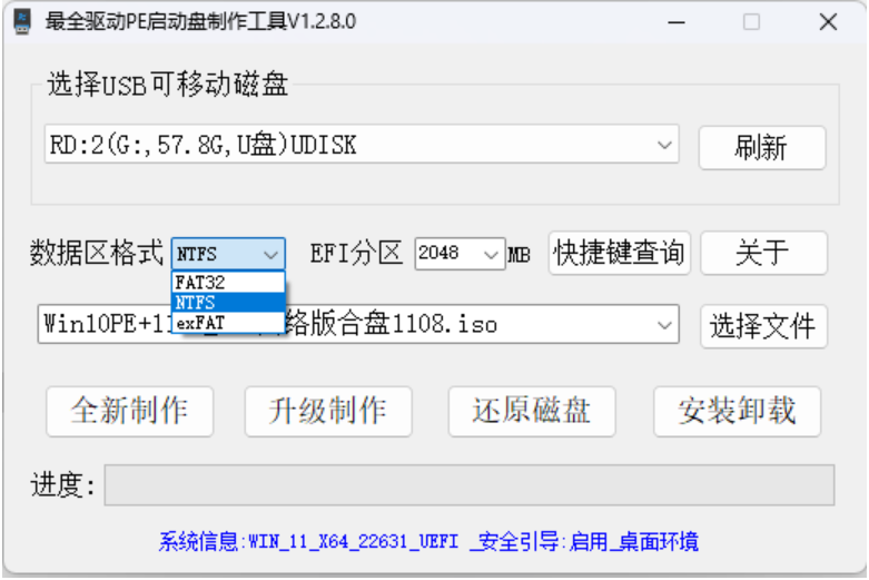 数据分区默认NTFS,可选FAT32和exFAT格式,还原磁盘时也根据选择格式进行还原为普通移动磁盘。还原磁盘速度略慢,请耐心等待。